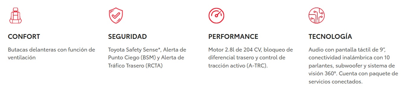 Equipada con motor de 2.8l con 204 CV. Transmisión automática de 6 velocidades. Modos de conducción "ECO, NORM y SPORT". Selector electrónico de 4x4.